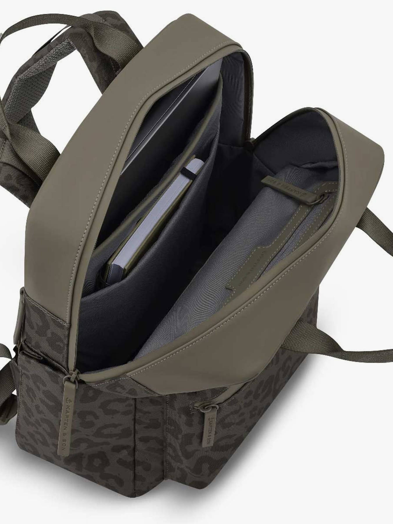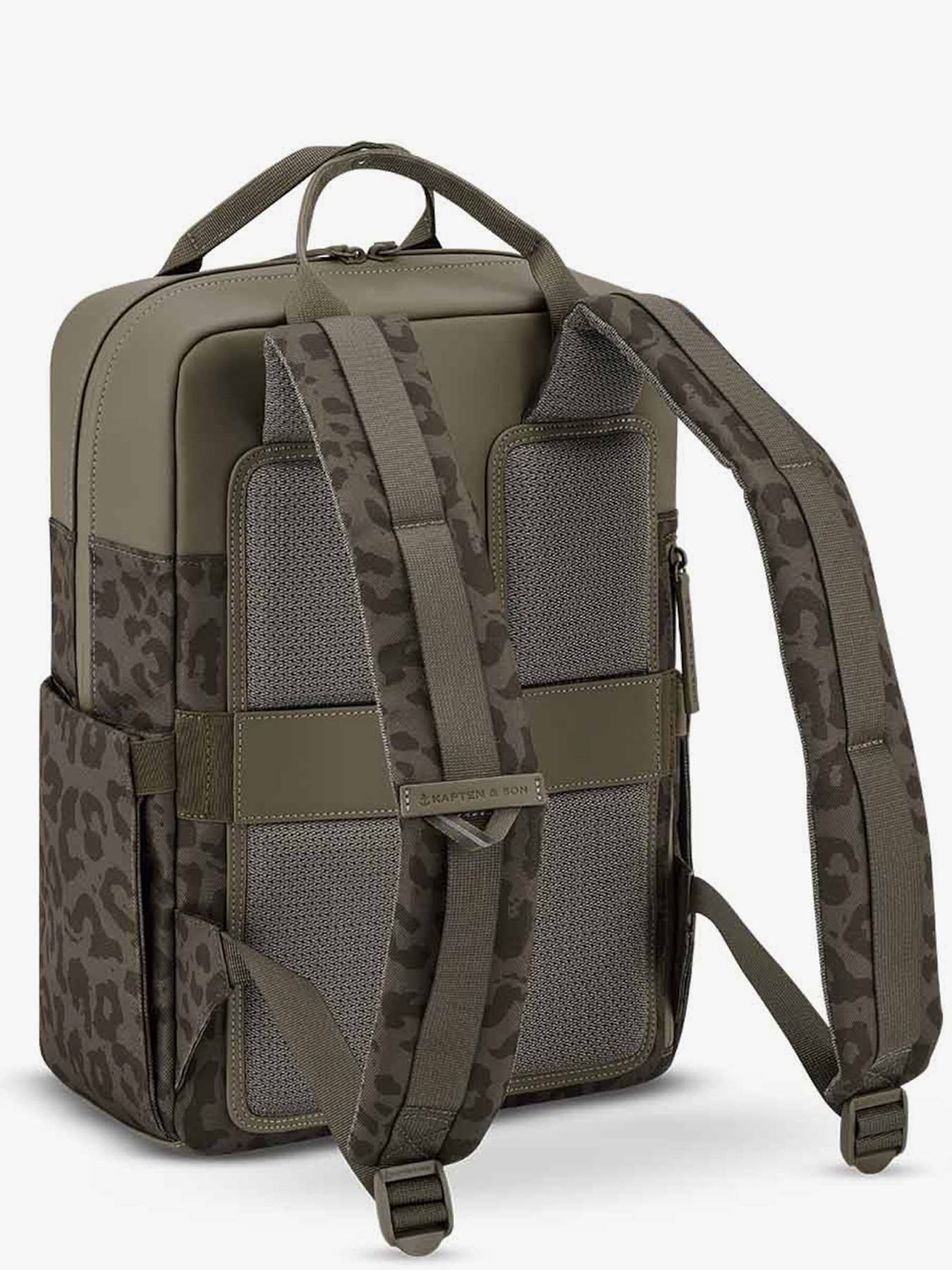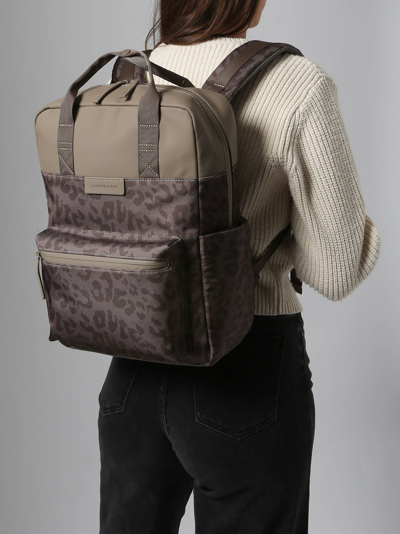 This backpack from the brand KAPTEN & SON is the perfect companion for an organized daily life with a trendy touch. Made from recycled PET, it combines durability and environmental friendliness without sacrificing style. Its modern design is enhanced by a leopard print pattern. Practical and well thought out, it features a zippered front pocket on the outside to keep your small essentials within easy reach. Its adjustable shoulder straps offer optimal comfort when worn on the back, while the top handle allows for easy hand carrying. The interior is spacious and functional, with a main compartment suitable for A4 documents, a slip pocket, a zippered pocket, and a dedicated compartment to protect a laptop up to 15 inches. A decidedly chic and practical backpack, ideal for expressing your style every day.