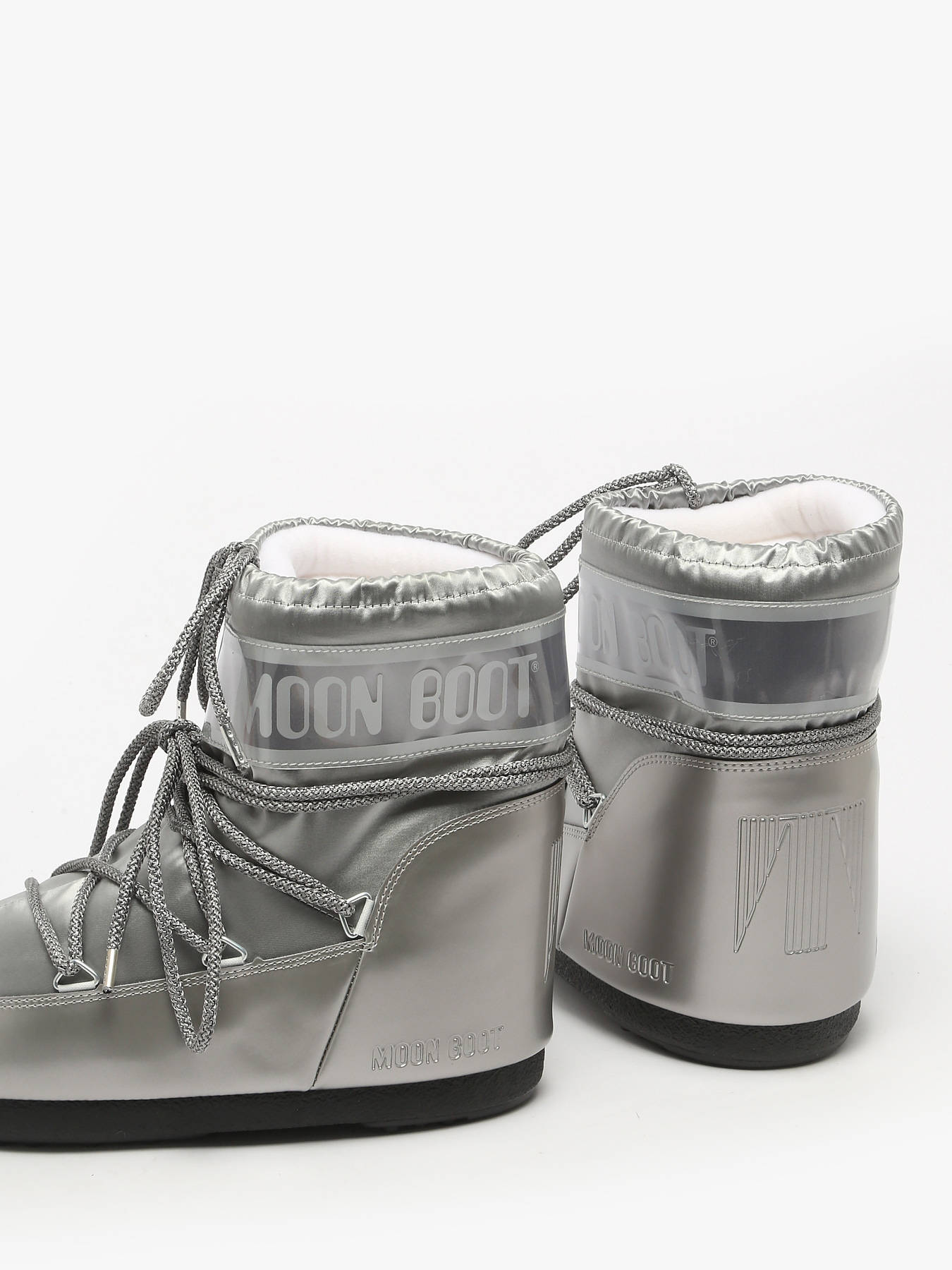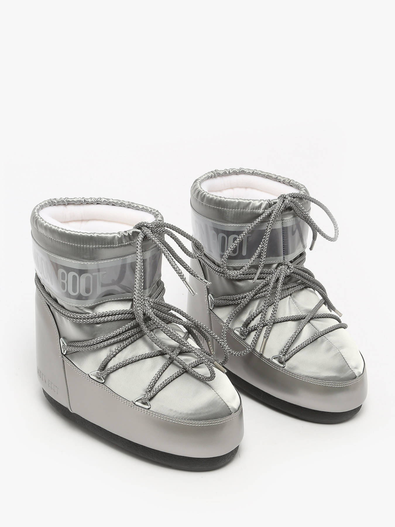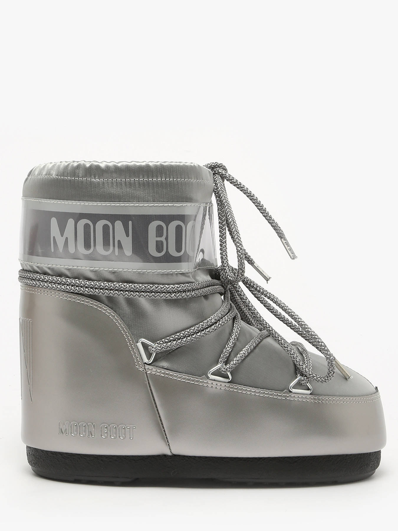 Discover the MOON BOOT Icon Low Glance Black satin boots, a bold model inspired by the 1969 moon landing and high-tech astronaut suit design. These ambidextrous boots can be worn on either foot thanks to a multi-size foam lining that slightly relaxes after a few hours, perfectly adapting to the shape of any foot for a secure and comfortable fit across a wide range of sizes. They provide optimal insulation with a lightweight midsole and maximum grip thanks to suction cups on the rubber outsole. Featuring a printed logo panel, PVC heel counter and trim, silver metal eyelets, tubular crisscross laces, and a top drawstring, they are easy to slip on, and we recommend sizing up for this model.