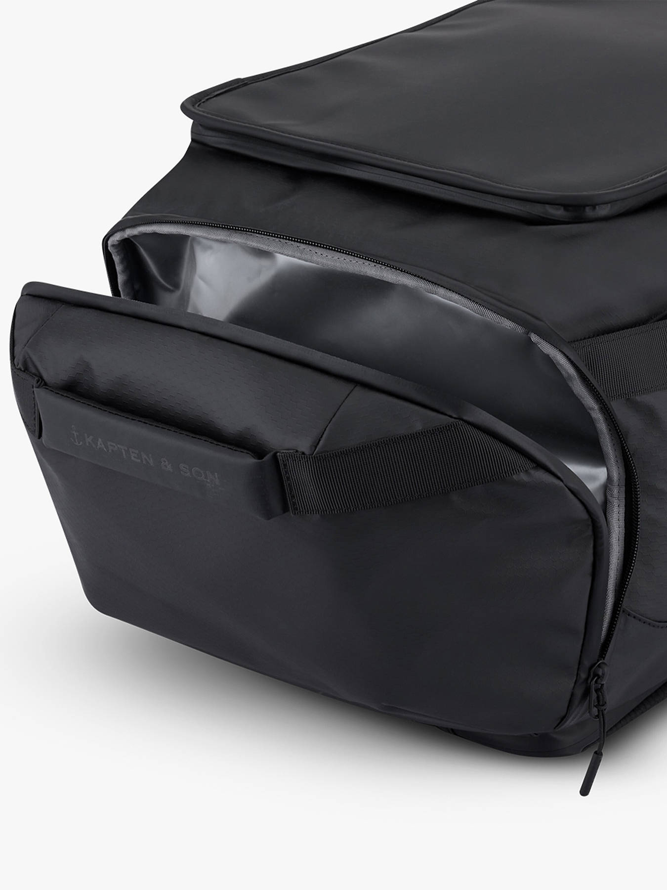 The KAPTEN AND SON cabin travel backpack in recycled P.E.T combines modern style, durability, and functionality. Designed for weekend trips, it features two interior compartments and one zip pocket, providing organized storage for clothing, accessories, and documents. Outside, two side pockets and a back pocket allow quick access to essentials. The top handle makes it easy to carry by hand, while the backpack design ensures comfortable shoulder wear. Lightweight and durable, it is perfect for short trips or urban commuting. Eco-friendly, stylish, and practical, this bag reflects KAPTEN AND SON craftsmanship, blending aesthetics, comfort, and sturdiness. Compact, versatile, and functional, it becomes the ideal companion for traveling in style while keeping your belongings organized.