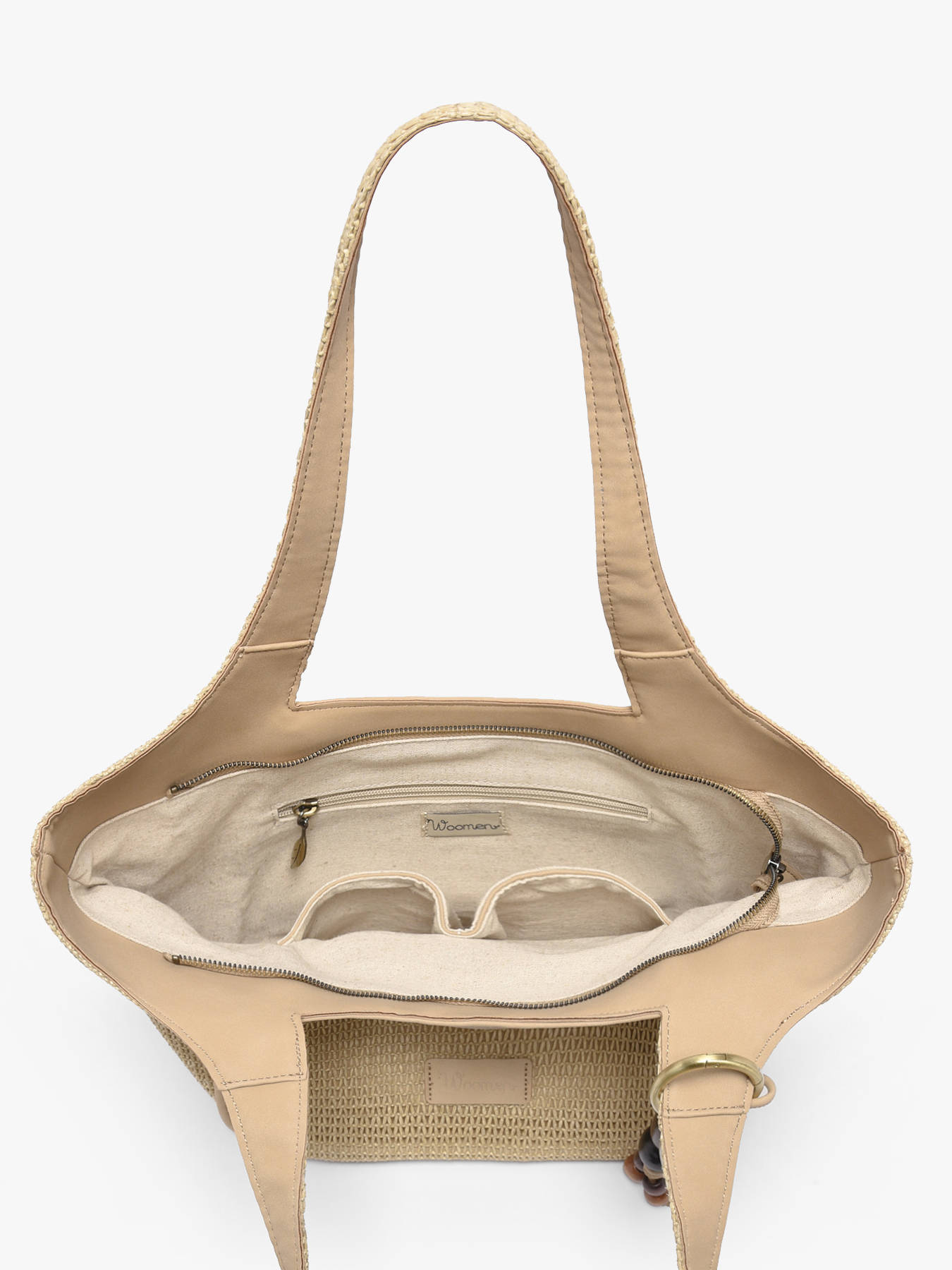 The WOOMEN Crocus Estival shoulder bag combines style, functionality, and lightness. Its main material, polyethylene trimmed with polyurethane, paired with a cotton and linen lining, ensures durability and comfort. This two-tone bag features a zip closure and a back zip pocket for convenient and secure access. Inside, a zip pocket and a slip pocket make it easy to organize your essentials. The beaded bag charm, sold with the model, adds a refined finishing touch and a summery accent, making this shoulder bag a practical, elegant accessory, perfect for complementing all your summer outfits.